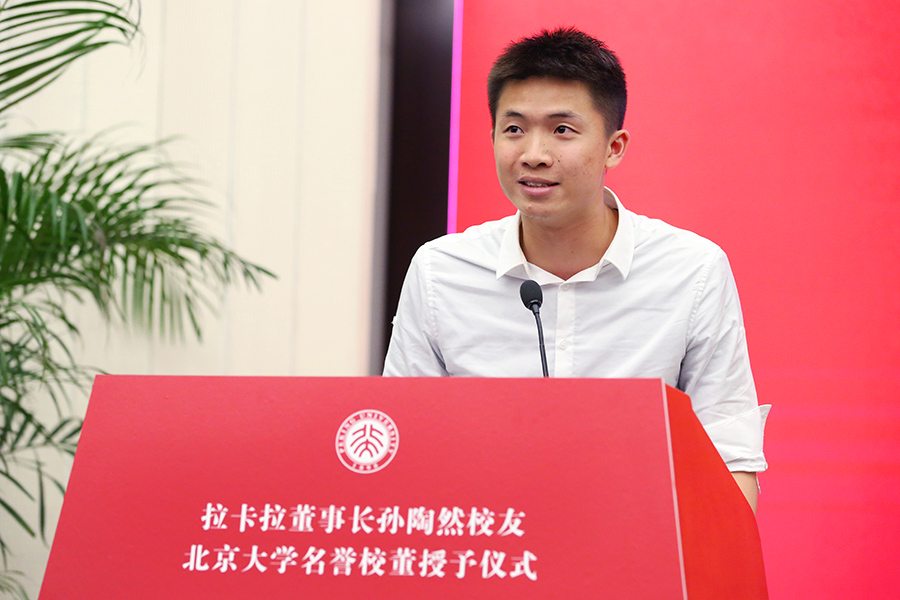 孙陶然校友表示,在北大四年的学习生活为自己带来了四笔受益终生的财富,即自信、圈子、学习能力和眼界,正是这些成就了今天的自己。他认为在“穷则独善其身,达则兼济天下”的理念之下,应该为母校、为社会做出贡献。孙陶然校友对于获得北京大学名誉校董这个新的身份感到非常荣幸,他认为这是对他的一份激励,更是对已走出北大和正在北大学习的全体北大人的一份激励,是希望大家能够更有作为,更多地关注和回馈母校。孙陶然校友表示,这个新的身份将是他未来心向母校和为母校做出更多贡献的开始。