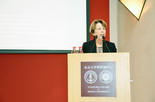 戴慕珍在致辞中对各位专家学者的到来表示热烈的欢迎。她指出,在过去5年中,北京大学斯坦福中心不仅为斯坦福大学师生了解和研究中国提供了重要的支持,同时也为中美两国乃至全球优秀学者提供了学术交流平台;建设世界一流大学已成为各国增强国家竞争力、发展高等教育的重要战略,论坛为更加深入地探讨这一问题提供了契机。戴慕珍感谢北京大学、北京大学教育学院对本届论坛的支持,并预祝论坛圆满成功。