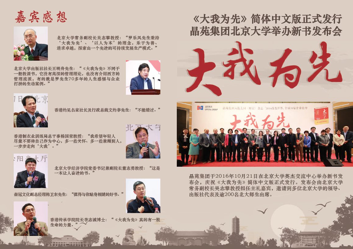 10月21日,香港晶苑集团主席罗乐风先生著作《大我为先》在北京大学英杰交流中心正式发布。罗乐风先生及夫人罗蔡玉清女士,罗氏慈善基金主席、北京大学名誉校董罗嘉穗小姐等嘉宾和北京大学常务副校长吴志攀教授,党委副书记叶静漪教授,校长助理、教育基金会秘书长邓娅博士及师生代表约200人共同参加了新书发布会。