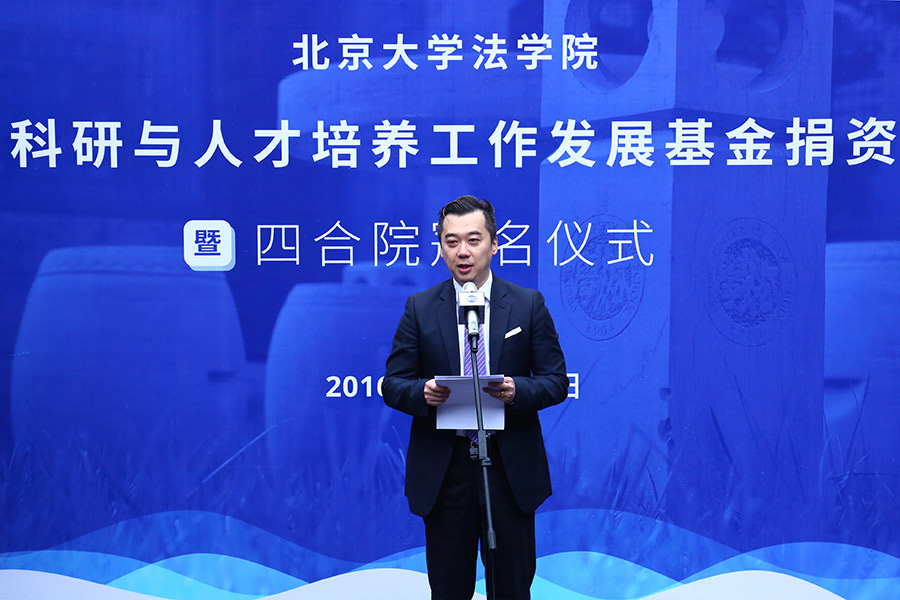捐资仪式上,祁国晟董事长对捐资设立基金和冠名蒋家胡同四合院深感荣幸。他表示,互联网科技的发展对社会带来的变革是巨大的,希望利用北京国双科技有限公司的技术优势,整合北京大学的学术资源,为中国法律学科建设及中国的法治事业贡献自己的一份力量。助理总裁石鹏先生作为北大法学院校友在致辞中回忆了美好的校园时光和师生情谊,分享了自己的执业经历和创业体验,并鼓励在场学生勇敢创新。