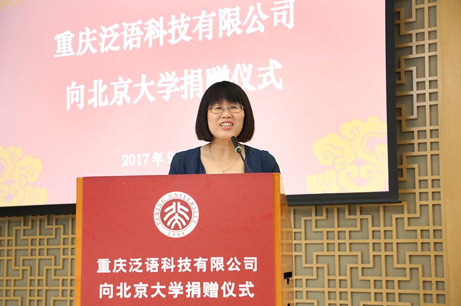 9月1日,重庆泛语科技有限公司向北京大学捐赠仪式在北京大学教育基金会北大之友报告厅举行。重庆泛语科技有限公司总经理谭涛先生、副总经理于慧芳女士出席仪式。北京大学副校长王博教授,教育基金会秘书长邓娅博士,信息管理系党委书记张久珍教授、副系主任王继民教授,及北大师生代表等出席,捐赠仪式由北大教育基金会副秘书长耿姝主持。
