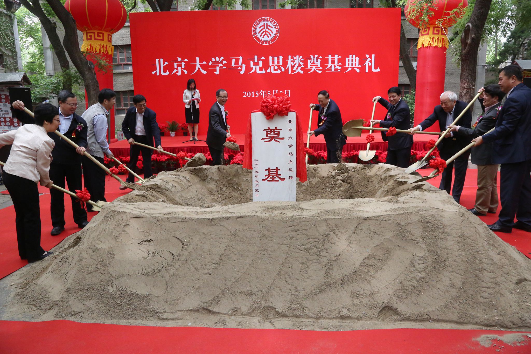 2015年5月5日是国际工人阶级和劳动人民的伟大导师马克思诞辰197周年。上午十点,北京大学 “马克思楼”奠基仪式举行。北京大学党委书记朱善璐、校长林建华、常务副校长刘伟、副校长王仰麟、马克思主义学院党委书记孙蚌珠等领导出席。学校党委宣传部、教务部、社会科学部、研究生院、图书馆、基建工程部、房地产管理部、公寓服务中心、保卫部等部门负责人同马克思主义学院师生一起参加了奠基仪式。中共中央党校副教育长、科学社会主义部主任王怀超、《求是》杂志副总编郑志晓代表北京大学中国道路与中国化马克思主义协同创新中心的协同单位参加了奠基仪式。北京大学校长助理、校基金会秘书长邓娅主持奠基仪式。