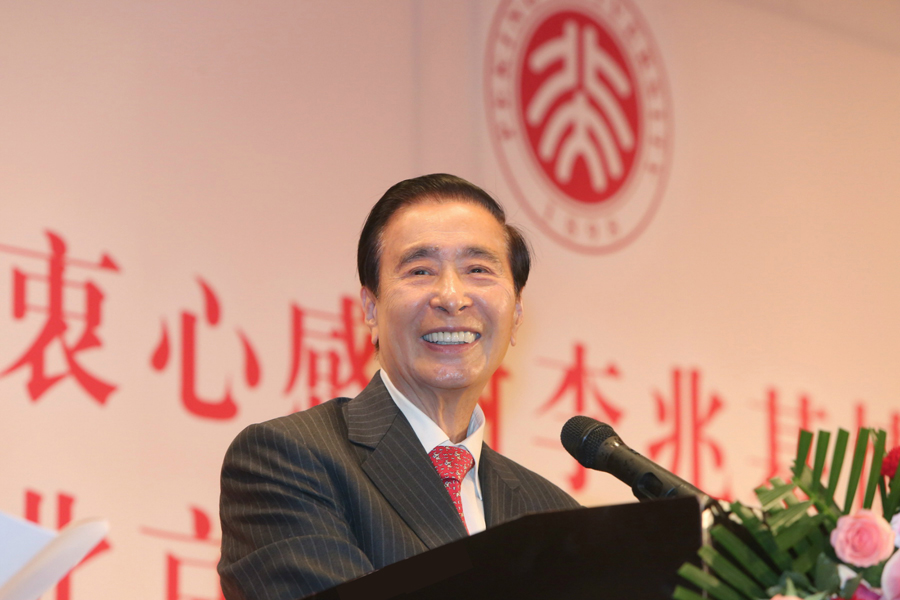 随后,李兆基先生登台讲话。他表示,希望北大同学们善用校园的设施,把握优势,坚毅学习,创造杰出的学术成就,将来学有所成,回馈社会,贡献国家。李先生还分享了自己的致富之道,特别强调“刻苦耐劳,勤奋勉力”是成功的首要因素。李先生风趣幽默的谈论,引来现场热烈的掌声。