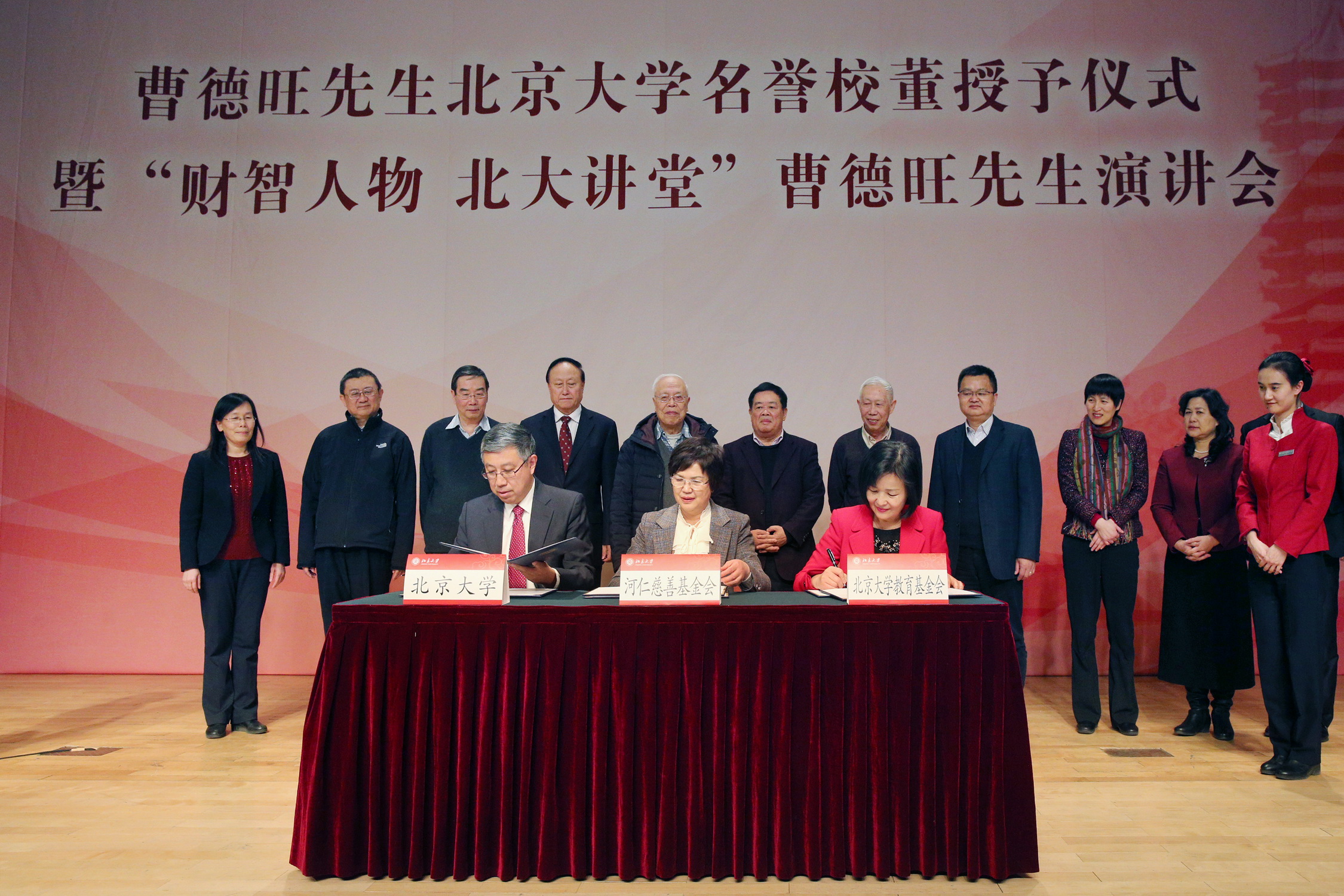 会上,河仁慈善基金会秘书长林瑞华与北京大学校长助理、教育基金会秘书长邓娅,数学科学学院院长田刚共同签署捐赠协议,捐资支持北京大学数学科学学院大楼的建设。