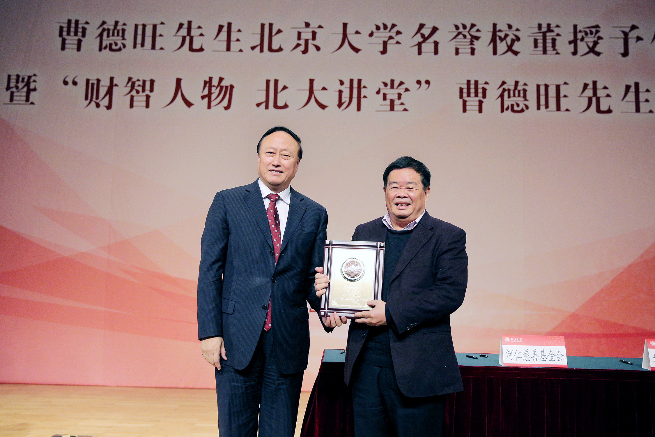 3月11日,春回燕园,曹德旺先生北京大学名誉校董授予仪式暨“财智人物北大讲堂”演讲会在北京大学百周年纪念讲堂多功能厅隆重举行。河仁慈善基金会发起人、福耀集团董事长曹德旺先生,河仁慈善基金会秘书长林瑞华女士一行莅临北京大学,与校党委书记朱善璐,副校长王杰,数学科学学院院长田刚院士,副教务长、学科建设办公室主任、数学科学学院党委书记张平文院士,数学科学学院姜伯驹院士、张恭庆院士、文兰院士,校长助理、教育基金会秘书长邓娅,校长助理、工会主席孙丽等师生代表共同见证了仪式。仪式由党委副书记叶静漪主持。