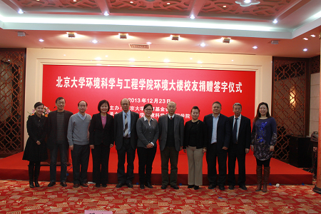 2013年12月23日上午,北京大学环境科学与工程学院在陈守仁国际会议中心举行校友捐赠环境大楼签字仪式。北京大学常务副校长吴志攀,校长助理、教育基金会秘书长邓娅,捐赠校友梁萍、宋金链、北大应用化学专业85级校友代表丛芳,以及环境科学与工程学院院长朱彤,副院长邵敏、王奇,党委副书记刘卉等参加。院党委书记胡建信主持捐赠仪式。