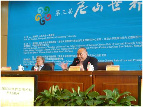 除了在论坛大会的发言,廖凯原教授与徐炳教授还参加了“与会学者院部讲座”活动,在山东大学法学院作了报告。以“中国梦就是轩辕大同”为题,廖凯原教授回顾历史,高度肯定了轩辕黄帝的伟大的历史功绩。他总结中国梦为“根据每个人的梦想和愿望,以其为始,以其为终”,表示我们前所未有地接近中国梦这一梦想。廖凯原教授对中国法治及义理的发展和在现代社会中的运用方面进行了详解,认为中国五千年的持续文明拥有来自于轩辕之“道”独特的科学观法治及义理之治。他归纳了轩辕文化的三个特点,并阐述了一种崭新的生存范式人生而自由,有无往不在而自由地生活,摆脱枷锁,我们终将自由!最后,廖凯原教授在优美的长笛伴奏声中抑扬顿挫的朗诵了诗歌《轩辕之大同》,深深的震撼了同学们的身心。