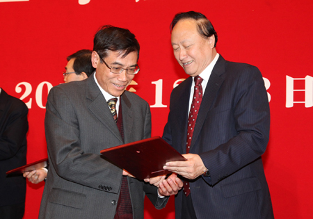 朱善璐书记为杨芙清-王阳元奖教金特等奖获得者朱玉贤颁奖 朱善璐、周其凤、吴志攀、敖英芳与捐赠方代表逐项为每一位获奖教师颁发奖教金。