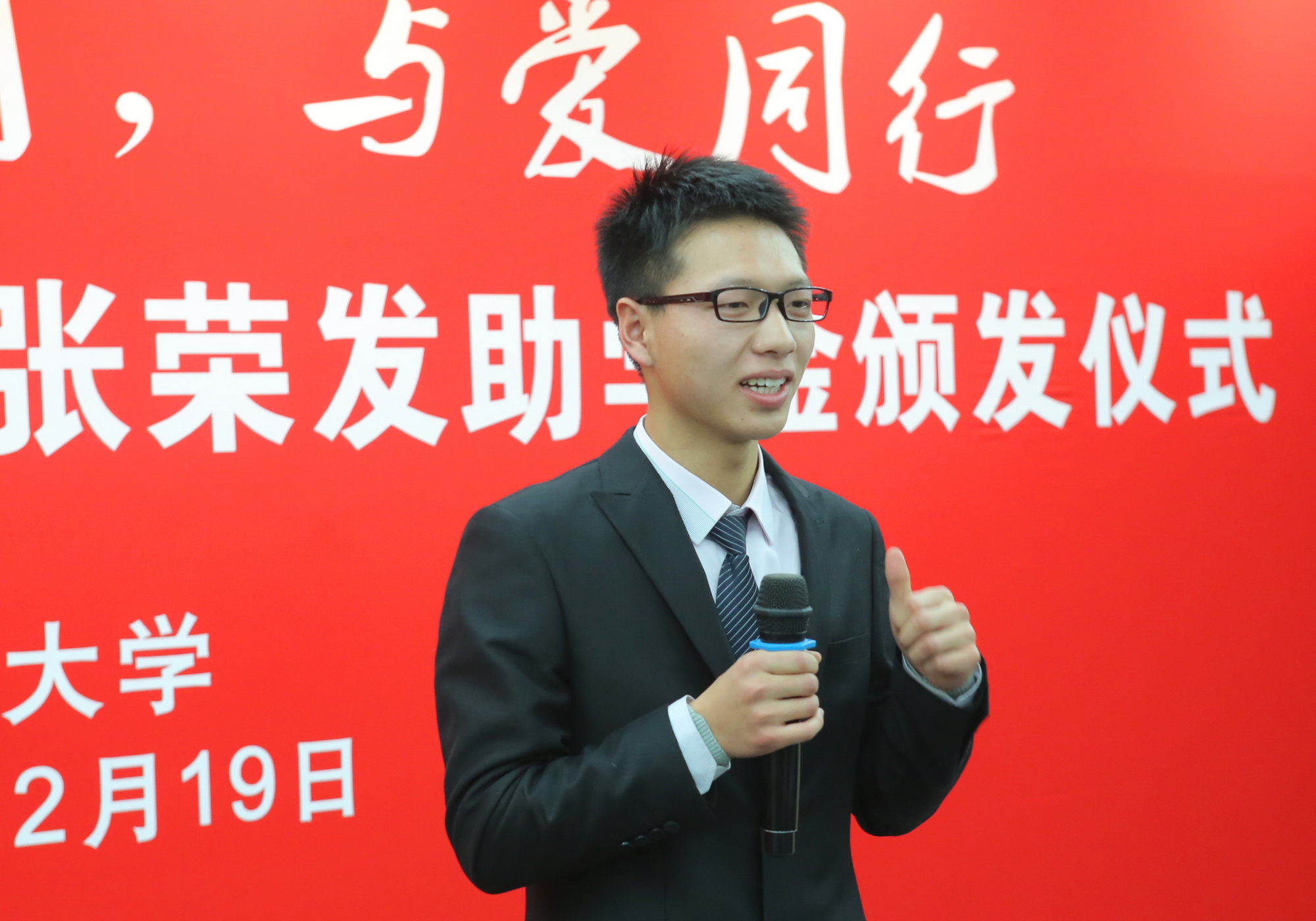 元培学院2014级本科生米登位代表获助学生对张荣发基金会的帮助和关爱表示诚挚地感谢。这笔助学金像一枚定心丸,让他们能抛开疑虑,放飞梦想。他更表达了自己将用实际行动书写感恩,让每一笔社会的关爱资金都用得其所的决心和信心。
