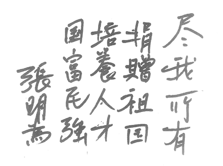 张忠言先生转达了张老先生对于北大及北大学子的期盼,他由衷希望北大不断努力,进一步提高世界排名;希望北大学子刻苦学习,涌现出更多的栋梁之才,为振兴中华贡献自己的力量。张忠言先生还向同学们展示了张老先生的一幅墨宝,“尽我所有,捐赠祖国,培养人才,国富民强”这十六个字深刻体现了张老先生的拳拳赤子心。