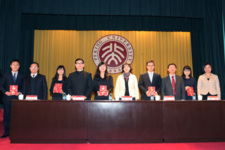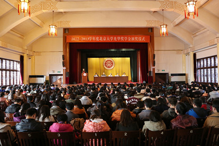 2013年11月14日下午, 2012-2013学年度北京大学光华奖学金颁奖仪式在办公楼礼堂举行。光华教育基金会颁奖嘉宾、台湾南山人寿保险股份有限公司上海代表处首席代表贾宁,北京大学常务副校长、医学部常务副主任柯杨,北京大学副校长、中国科学院院士高松,北京大学校长助理、教育基金会秘书长邓娅,北京大学学生工作部部长张庆东出席。颁奖仪式由张庆东主持。