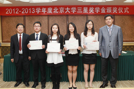 颁奖仪式由赵文莉主持。仪式上,刘德英介绍了2012—2013学年度北京大学三星奖学金的评审状况并宣读获奖学生名单。 2012-2013学年度三星奖学金的评审工作严格按照三星集团与北京大学签订的奖学金协议及《北京大学学生奖学金评审条例》的规定进行。经院系初评、公示、征求意见及校学生奖学金评审委员会审议,2012—2013学年度北京大学共评出来自数学科学学院等7个院系的17名同学获奖。