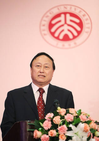 随后,朱善璐发表了《圆梦北大,筑梦中华》的主题演讲。他从北京大学的历史渊源娓娓道来,并通过新文化运动、五四运动、中国共产党的创建等发源于北京大学的、深刻影响中国近现代进程乃至世界历史的重大事件,强调北京大学不仅承担着中国高等教育的使命,也与国家的命运紧密相连,这在全世界高等学府中都是极为罕见的。朱书记还介绍道,在北京大学二十周年纪念会上,蔡元培校长表达了与当时的世界一流大学柏林大学、莱比锡大学等“平行之发展”的强烈愿望,可惜当时国家“百事停滞不前”,未能实现这个愿望。朱善璐提出,在95年后的今天,北京大学应当拿出令人满意的答卷,以回应蔡先生等北大先人的宏愿。他向全场嘉宾详细解读了北京大学“2048远景规划”和三步走的发展战略,表示北京大学力争在建校150周年、也就是中华人民共和国建国100周年前夕,建成中国特色、世界一流、北大气派与品格的最好的大学,能够代表国家和民族在世界上赢得尊严和骄傲。这不仅是全体北大人的心愿,更是党和国家对北大的历史要求,是全社会对北大的殷切期待。朱善璐引述习近平总书记给北大青年的回信内容时指出,在“中国梦”的感召下,北京大学必须接过先人的旗帜,在创建世界一流大学的征程上走好每一步。他对社会各界友人对北京大学的认识、理解、宽容、厚望,和给予北大精神、道义和物质上的支持表示诚挚的感谢,并表示,北京大学一定不会让社会各界失望,在同心共筑中国梦的征程中,北大愿与各位朋友并肩携手、齐心协力,为国家和民族做出新的历史性贡献。朱善璐的演讲感染了现场嘉宾,赢得了经久不息的掌声。