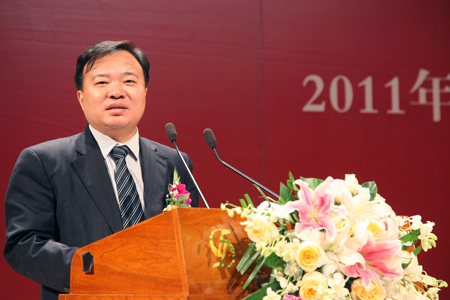在大家的热烈掌声中,刘永好登上讲台发表演讲。他首先回顾了与北大的渊源,特别是与厉以宁、林毅夫、吴志攀、俞孔坚等北大教授在推动“非公”经济发展、研究三农问题、组建民生银行、参与成渝统筹城乡综合配套改革试验区建设等问题上的合作,感谢北大对企业的支持。他简要回顾了自己从“鹌鹑大王”、“饲料大王”逐渐发展壮大企业的历程,讲述了集团为建立规范、安全、高效的农牧产业链所做出的种种努力,以及未来在保护食品安全方面的构想。刘永好表示:“今天,中国农牧产业的转折点到来了!”他说:新希望集团目前已经达到了世界级农牧企业初级标准,希望通过十年的努力达到高级标准。他希望能有一大批优秀人才加入企业,与中国民营企业共进步,与中国经济共进步。刘永好先生热情洋溢的演讲感染了现场每一位学子,频频获得热烈的掌声。