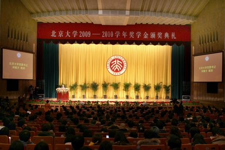 12月17日下午,北京大学2009-2010年奖学金颁奖典礼在百周年纪念讲堂举行。方正集团、汉能、百度等社会企业代表,北京大学党委书记闵维方、校长周其凤等共同参加颁奖典礼。