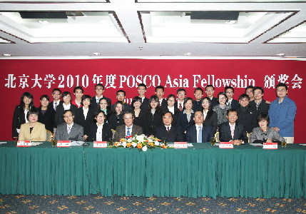 2010年10月27日下午,北京大学2010年度POSCO Asia Fellowship奖学金颁奖会在英杰交流中心第二会议室举行。POSCO青岩财团常任副理事长崔光雄、浦项中国投资有限公司(POSCO-China)社长郑吉洙、浦项中国投资有限公司对外协力部长孙正烈以及北京大学党委副书记张彦、教育基金会副秘书长赵文莉、学生工作部副部长查晶等出席会议并为获得2010年度POSCO奖学金的学生颁奖。