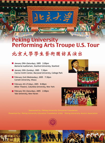 2005年1月27日,北大校长许智宏院士将率领北京大学学生艺术团赴美访问,在美国斯坦福大学、马里兰大学、康奈尔大学、哥伦比亚大学、耶鲁大学进行为期12天的巡演。1月29日下午,在能容纳1700人的斯坦福大学的纪念剧场Memorial Auditorium,北京大学学生艺术团将以富有民族特色的精品节目——汉族舞蹈《放风筝》拉开“北京大学学生艺术团访美演出”的序幕。