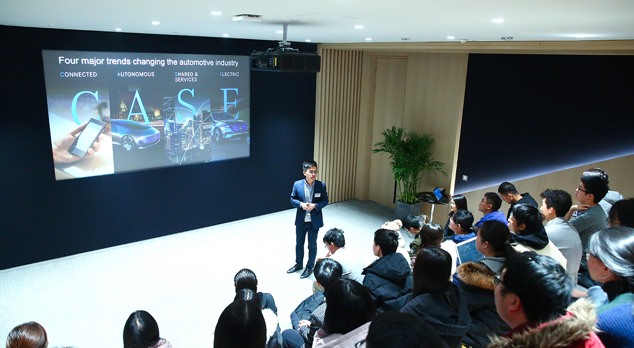 戴姆勒大中华区投资有限公司雇主品牌与招聘部苑硕向同学们介绍了戴姆勒公司的历史与发展。今年戴姆勒公司启动了新的公司架构,同时积极探索新的组织形式,力争更有效率地完成工作。现就职于戴姆勒的北大校友张博君、黄兢向同学们讲述了自己与戴姆勒结缘的经历,并亲切回答同学们的提问。他们叮嘱师弟师妹们要珍惜北大提供的丰富资源,提升能力,做好职业规划,朝着自己想要实现的方向不断努力。