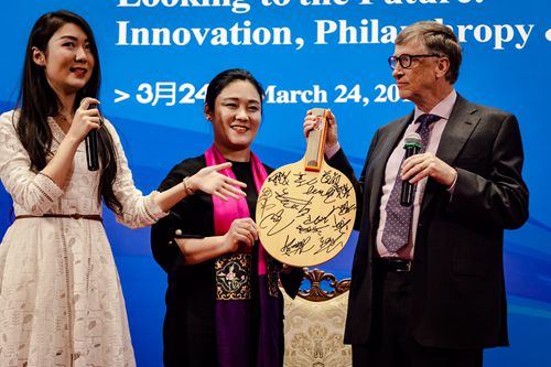 演讲会上,七届乒乓球世界冠军得主、北京大学教授刘伟代表全体北大师生将一块众多中国乒乓球世界冠军签名的乒乓球拍赠予盖茨