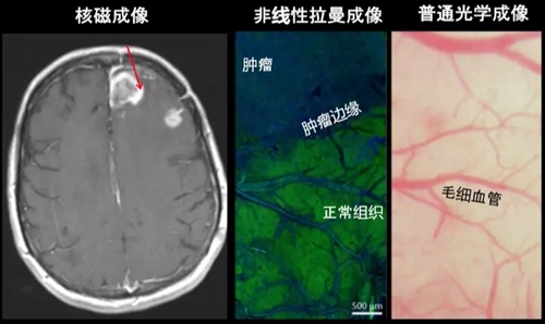 核磁成像(左)能看到大脑中的肿瘤,但空间分辨率不足以区分肿瘤边界。传统光学成像需要复杂的染色,否则不能看到单个细胞(右):而利用无标记拉曼成像(中)脑外科医生可以区分肿瘤(蓝,蛋白质分子为主)和正常脑组织(绿,脂肪分子为主)