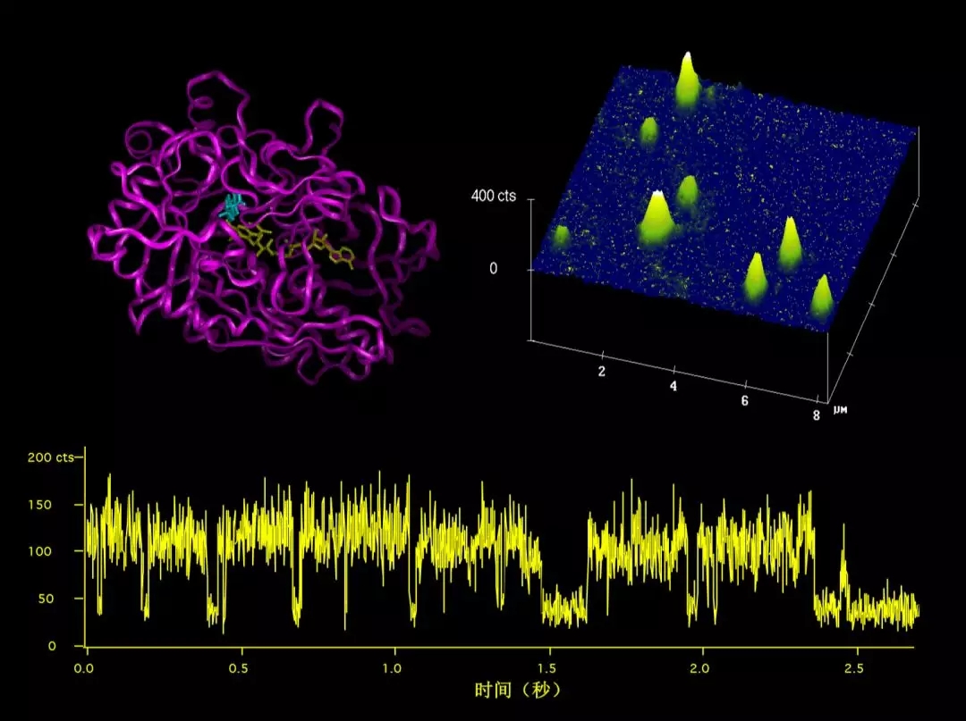 1998年在PNNL获得的胆固醇氧化酶(左上)的单分子们的荧光成像(右上)和其中某个酶分子的随机酶循环反应的实时观测