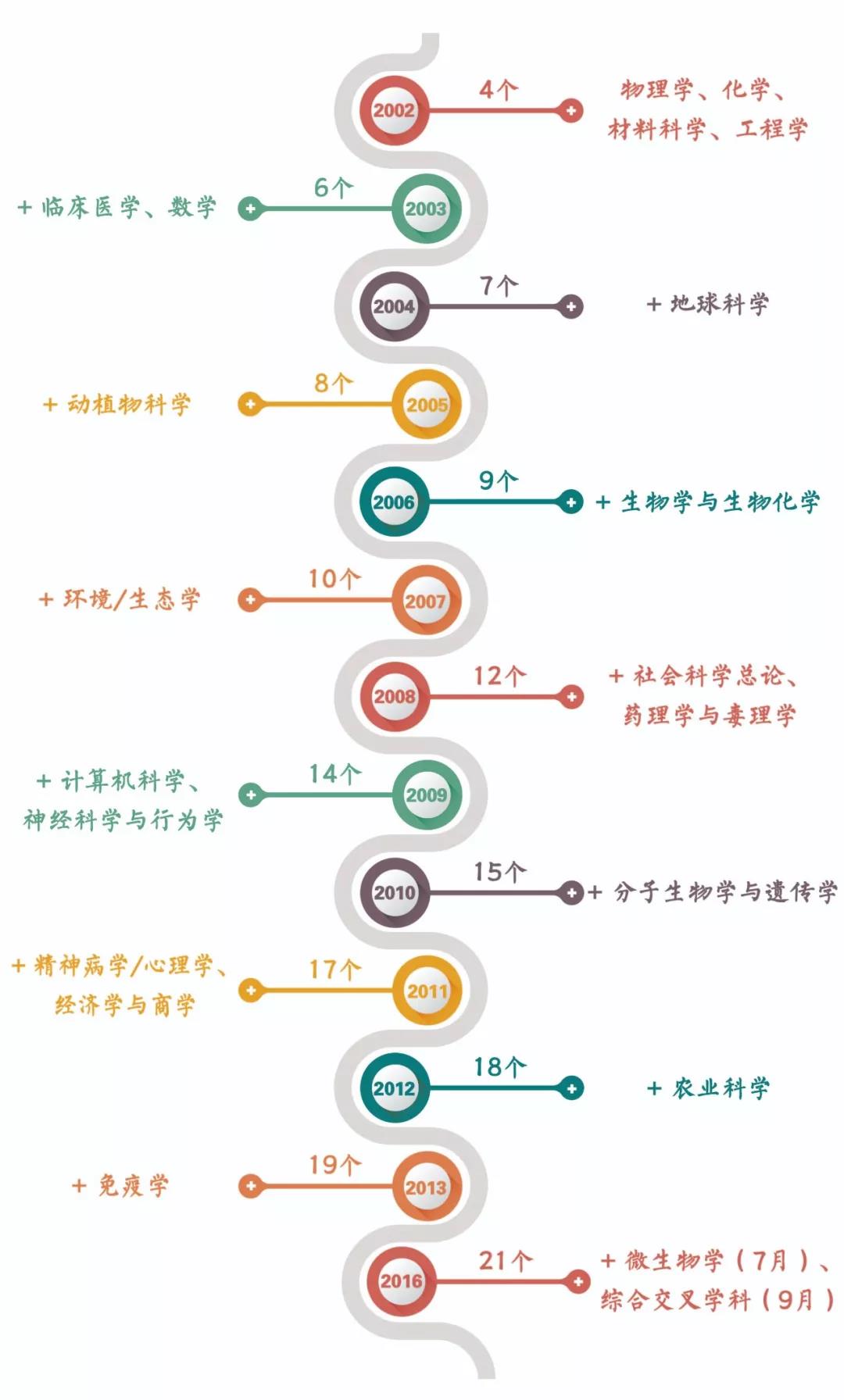 从2002年至2016年,北京大学入围ESI前1%的学科从4个增加到21个,保持至今。