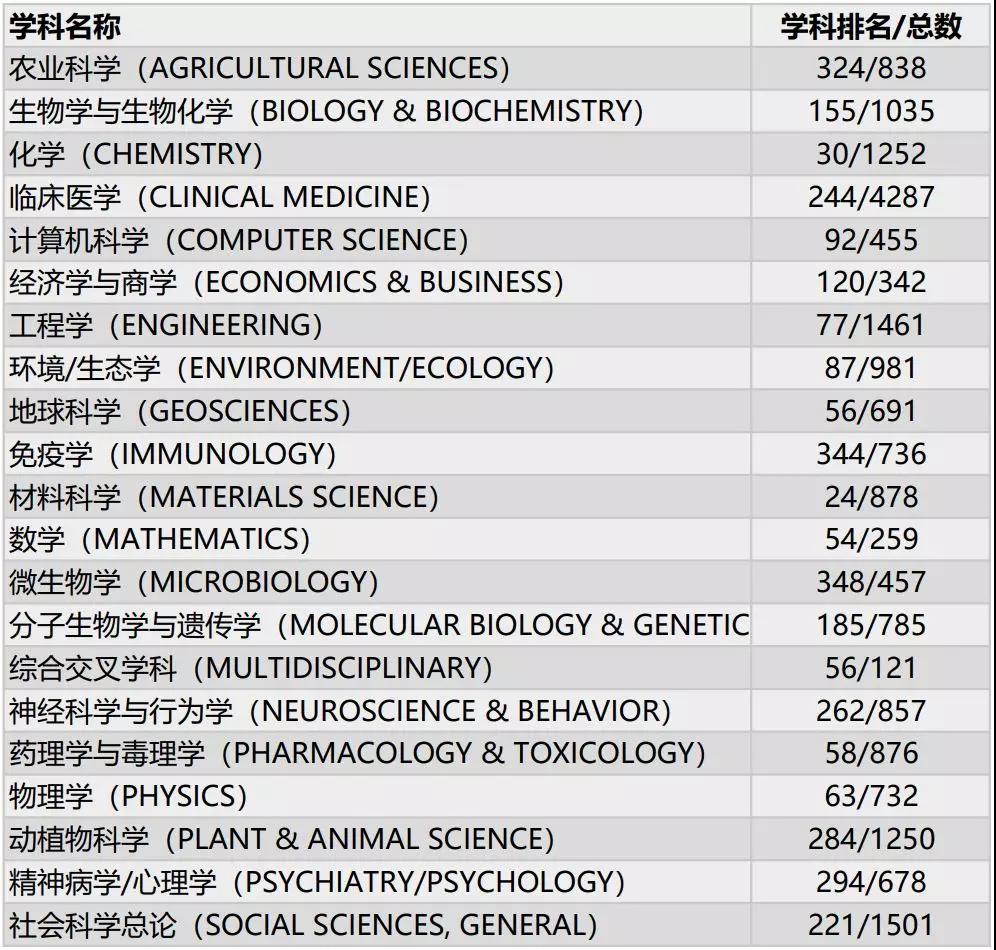 其中化学、临床医学、工程学、环境/生态学、地球科学、材料科学、药理学与毒理学和物理学八个学科,跻身全球排名前列;经济学与商学、数学和社会科学总论等学科处在国内领先地位。