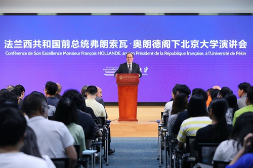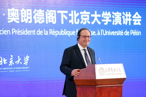 2018年5月25日,法兰西共和国前总统弗朗索瓦·奥朗德(François Hollande)访问北京大学,在光华1号楼898创新空间发表题为“欧洲一体化”的演讲,探讨欧盟的优势、风险、应对挑战的办法以及中欧关系等问题,并与现场北大学生进行了交流。演讲会由北京大学法语系系主任董强教授主持。