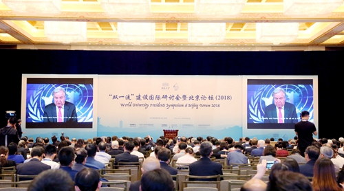 主旨发言开始前,联合国秘书长安东尼奥·古特雷斯(Antonio Guterres)通过视频方式发表了致辞。古特雷斯热烈祝贺北京大学建校120周年,并非常赞赏“双一流”建设国际研讨会及国际学术界对联合国工作的推进。他表示,人类世界适逢非凡的发展机遇,谋求共同进步,但同时也面临诸多挑战。古特雷斯希望与大家一同努力,实现全人类共享的和平与繁荣。