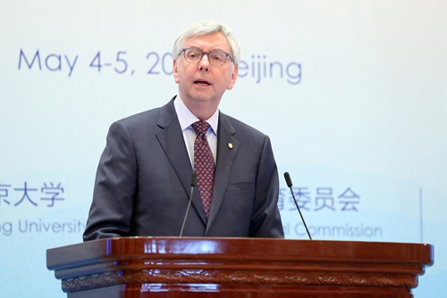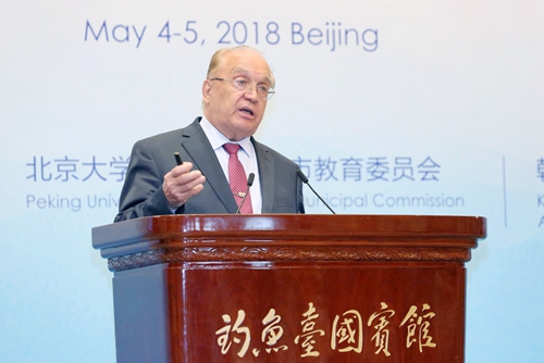 美国芝加哥大学校长罗伯特·季默(Robert Zimmer)发表题为“持久的价值观与伙伴关系:大学的延续与变革”的主旨发言,讨论世界领先大学的持久价值观、这些价值如何随着时间推移以新的方式得以实现,以及芝加哥大学与北京大学的伙伴关系。