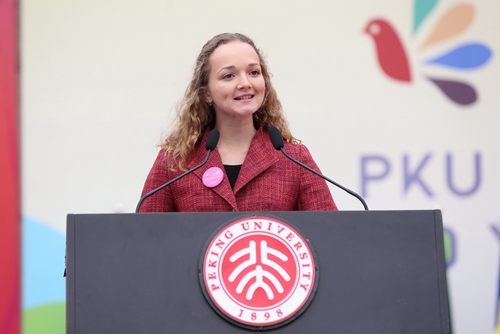 2018级俄罗斯学生娜斯佳(Anastasia Kurbatova)代表留学生发言,学校多元化的氛围培养了大家的包容性与合作精神,在短短两个月的时间里,她感受到了一个国际化的北大,校园成为重要的跨文化交流的平台,为大家交流、合作提供了多种可能,帮助大家更好地了解世界,同时还与来自各个国家的同学们建立深厚的友谊,互相学习、共同进步。