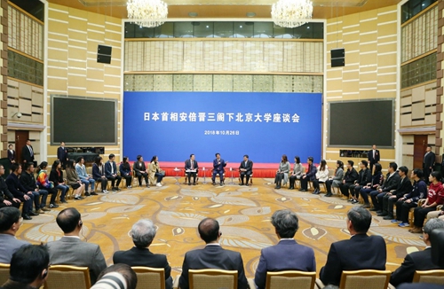 2018年10月26日下午,日本首相安倍晋三访问北京大学,与北大学子开展座谈会。中国驻日本特命全权大使程永华,日本驻华大使横井裕,外交部亚洲司参赞薛剑,教育部副部长孙尧,北京大学党委书记、校务委员会主任邱水平,校长郝平,副校长陈宝剑共同出席座谈会。
