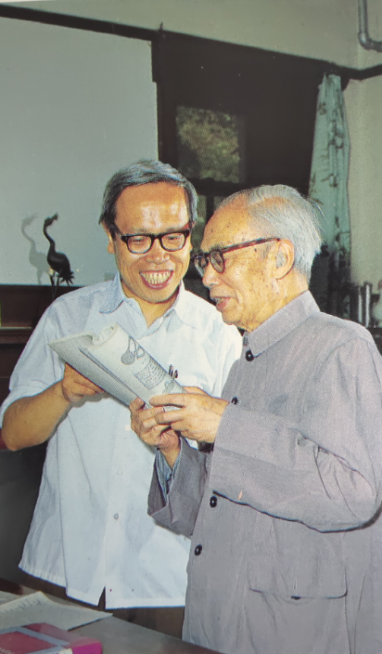 数学系教授江泽涵(右)与姜伯驹(左)一起讨论问题