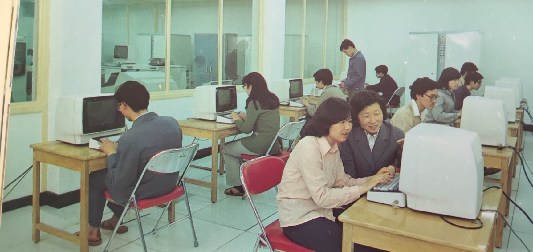 1983年,计算机科学技术系教授杨芙清(前排左二)在辅导研究生