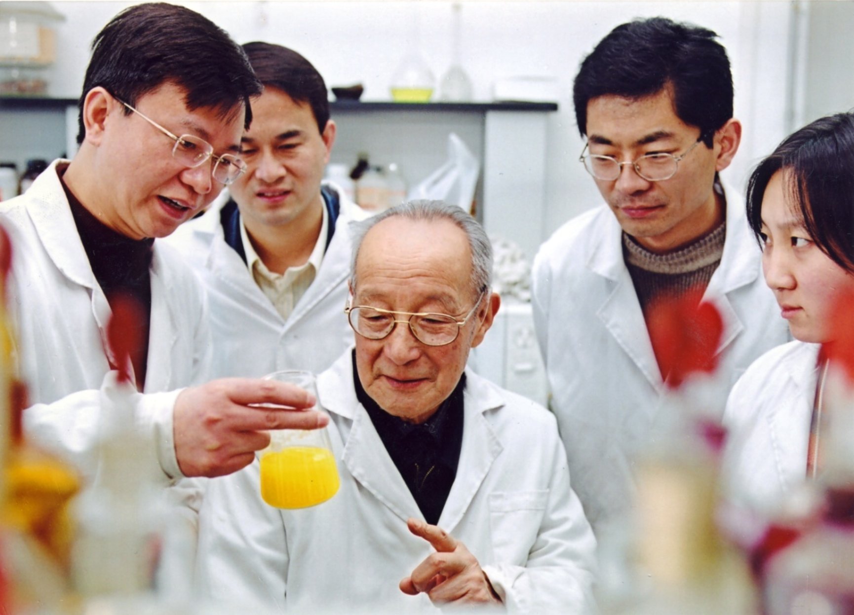 北京大学化学与分子工程学院教授徐光宪院士(中)在指导团队进行实验
