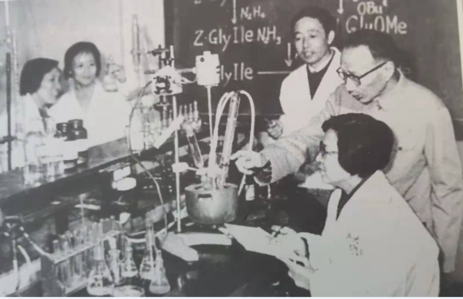 北大人在核工业领域大显身手的同时,在多肽化学的研究方面也取得了重大进展。1964年,北京大学化学系与中国科学院有机化学研究所、生物化学研究所“兵团作战”,共同从事胰岛素的合成工作。1965年,科学家们在世界上第一次用人工方法合成了具有与天然分子相同化学结构和完整生物活性的蛋白质——结晶牛胰岛素,标志着人类在认识生命、探索生命奥秘的征途中迈出了关键性的一步,开辟了人工合成蛋白质的时代,在生命科学发展史上产生了重大的意义与影响。