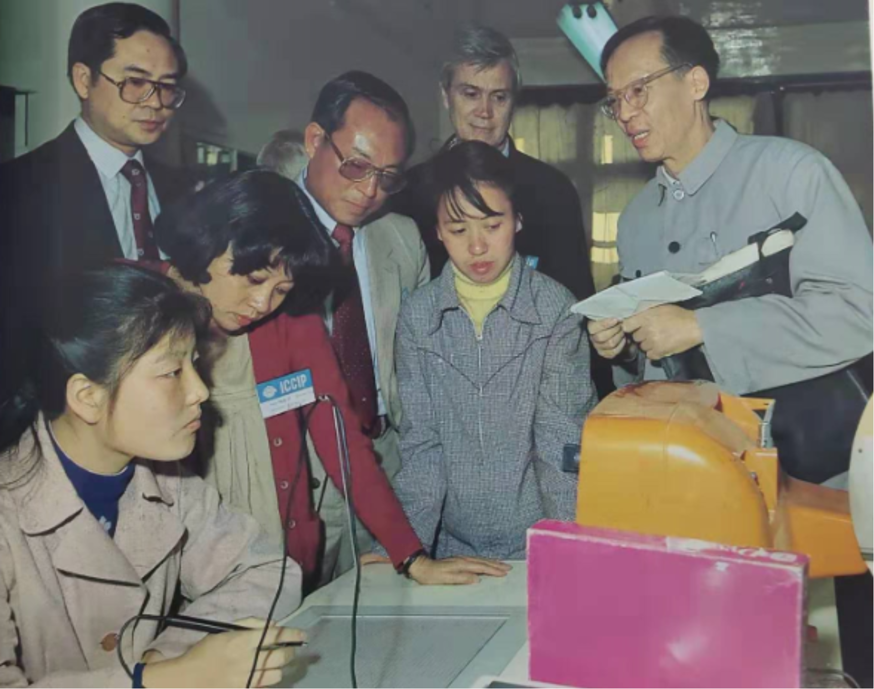 1981年,汉字激光照排系统原理性样机研制成功,王选在向来访者介绍该系统性能
