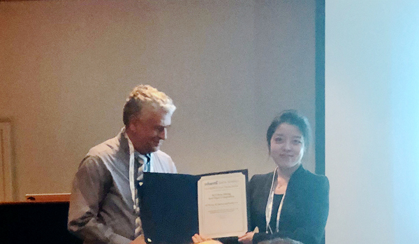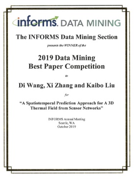 王迪获奖论文题目为“A Spatiotemporal Prediction Approach for A 3D Thermal Field with Sparse Data”。该论文充分考虑工程系统的温度时空动态耦合特性和温度传感器数据缺失问题,综合利用数据分析和动力学建模技术,建立基于热力学和时空迁移学习联合模型,创新性地提出一种全局的时空预测模型。她针对我国储备粮库的实际情况,考虑多个具有相似属性的工程系统的温度传感器数据对目标温度系统进行预测,实现对未来短期内工程温度系统的精准预测,在工程服务系统具有广泛的应用性。该研究成果已形成软件并在我国储备粮库质量监测系统中进行示范应用。INFORMS数据挖掘方向评奖委员会对该论文给予一致肯定和高度评价。评奖委员会主席、来自美国路易斯安那州立大学的Evangelos Triantaphyllou教授称其具有重要的理论价值与应用前景。佛罗里达大学工业与系统工程系主任在现场听完王迪汇报后,鼓励她申请今年该校长聘教轨助理教授职位。