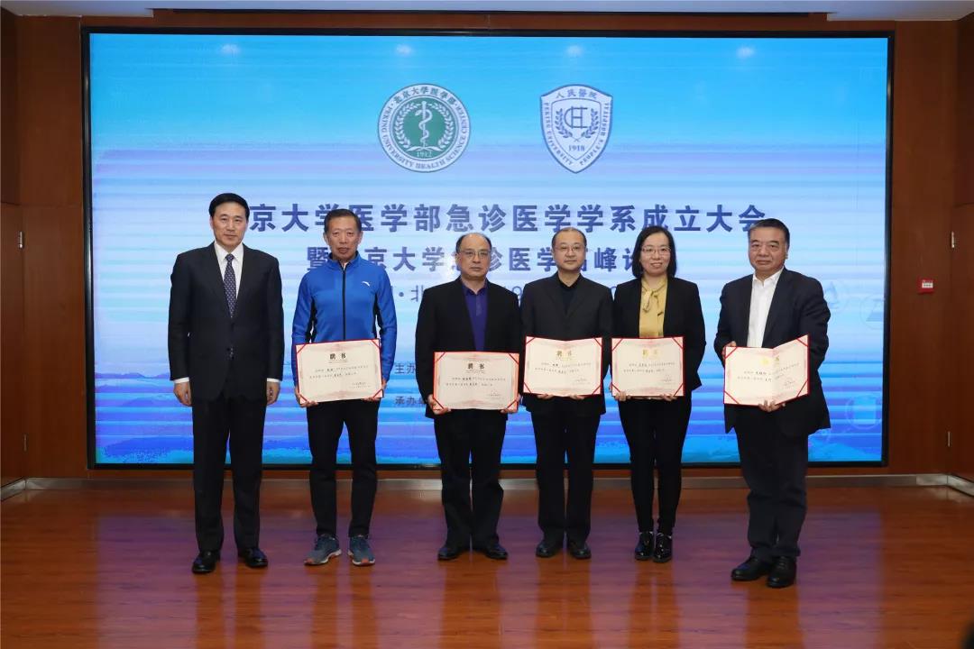 北京大学人民医院副院长张俊,北京大学医学部急诊医学学系主任、北京大学人民医院急诊科主任朱继红为北京大学急诊医学学系揭牌。于学忠教授、吕传柱教授、熊辉教授、马青变教授、张国强教授、赵斌教授、张利华教授、周启棣教授共同上台见证。