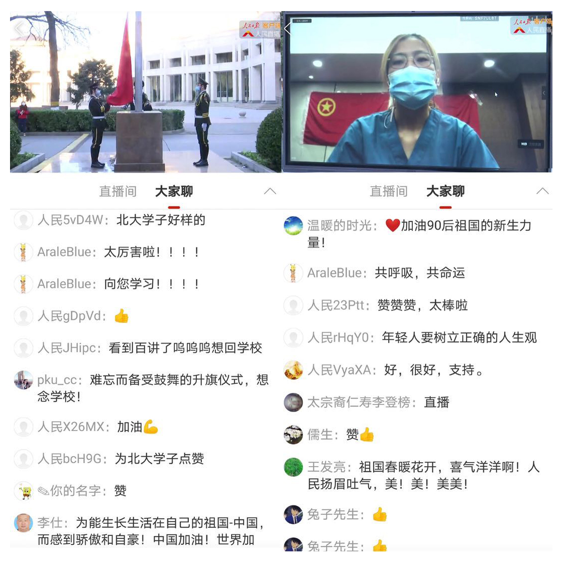 本次活动由人民日报客户端进行了现场直播,大家纷纷留言点赞。在这场“同升国旗,共学回信”主题升旗仪式中,北大援鄂医疗队90后党员、在北大首钢医院实习的西藏大学医学院学生、在雪域高原从事基层工作的北大选调生、在西部支教扶贫的研究生支教团志愿者的事迹深深感动着线上观看升旗仪式的34万余人(截至上午9点半),广大青年学子不惧风雨、勇挑重担的坚定信念和爱国主义精神,与鲜红的国旗一同飘扬在北大上空,飘扬在广大青年的心中。
