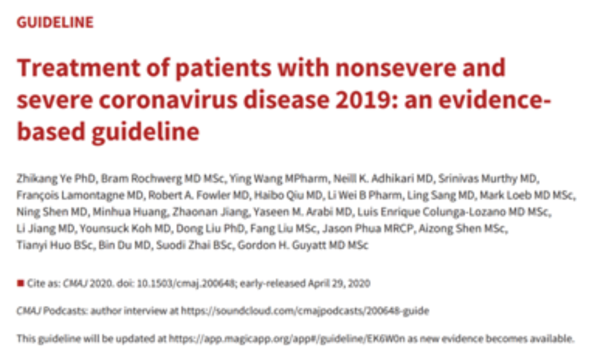 新型冠状病毒肺炎(coronavirus disease 2019,COVID-19)暴发以来,北京大学第三医院药剂科及各医疗团队快速响应、集结力量,投身疫情防控的各项工作中。自2020年1月29日起,在中国药学会医院药学专业委员会的支持下,北京大学第三医院药剂科翟所迪教授与药剂科团队代表中国药学会医院药学专业委员会受邀作为共同发起人,与循证医学创始人、加拿大麦克马斯特大学循证医学中心Gordon H. Guyatt教授团队一起,同来自全球6个国家的24名专家与2名患者代表组成指南制定团队共同制定了《COVID-19重症与非重症患者治疗的临床指南》。指南全文于4月29日发表于Canadian Medical Association Journal。