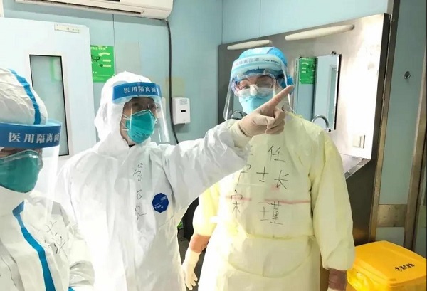 李六亿(中)在金银潭医院新冠肺炎重症病房督导院感防控