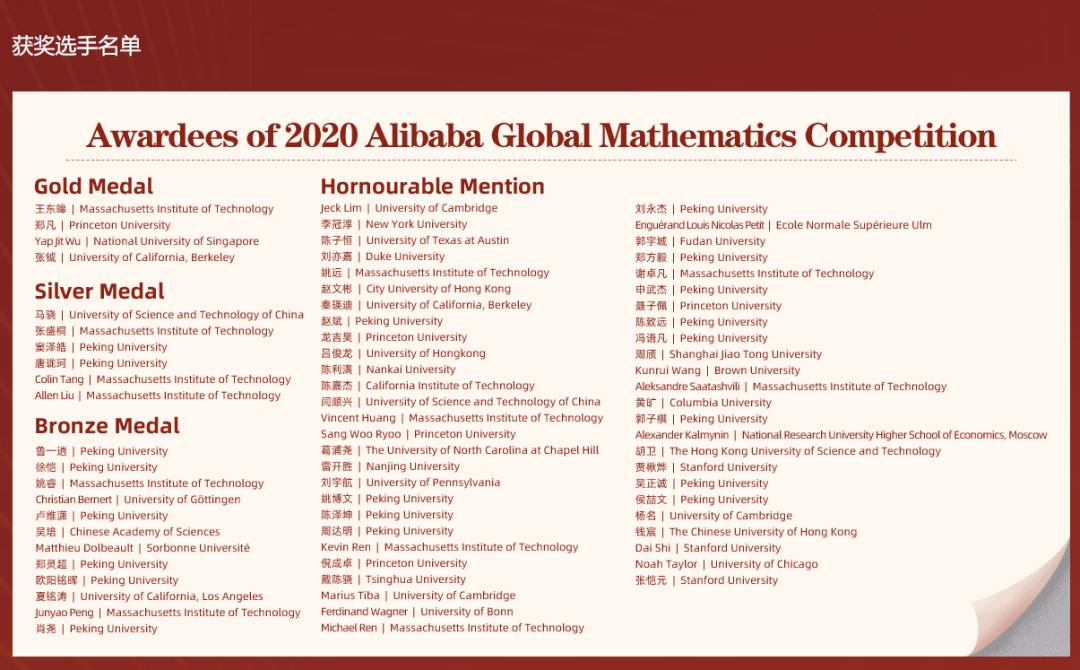 龙吉昊,优秀奖,2015—2019年在北京大学数学科学学院学习并获学士学位,现在普林斯顿大学攻读博士学位,中学毕业于湖北省沙市中学,同时也是第一届阿里巴巴数学竞赛银奖获得者。
