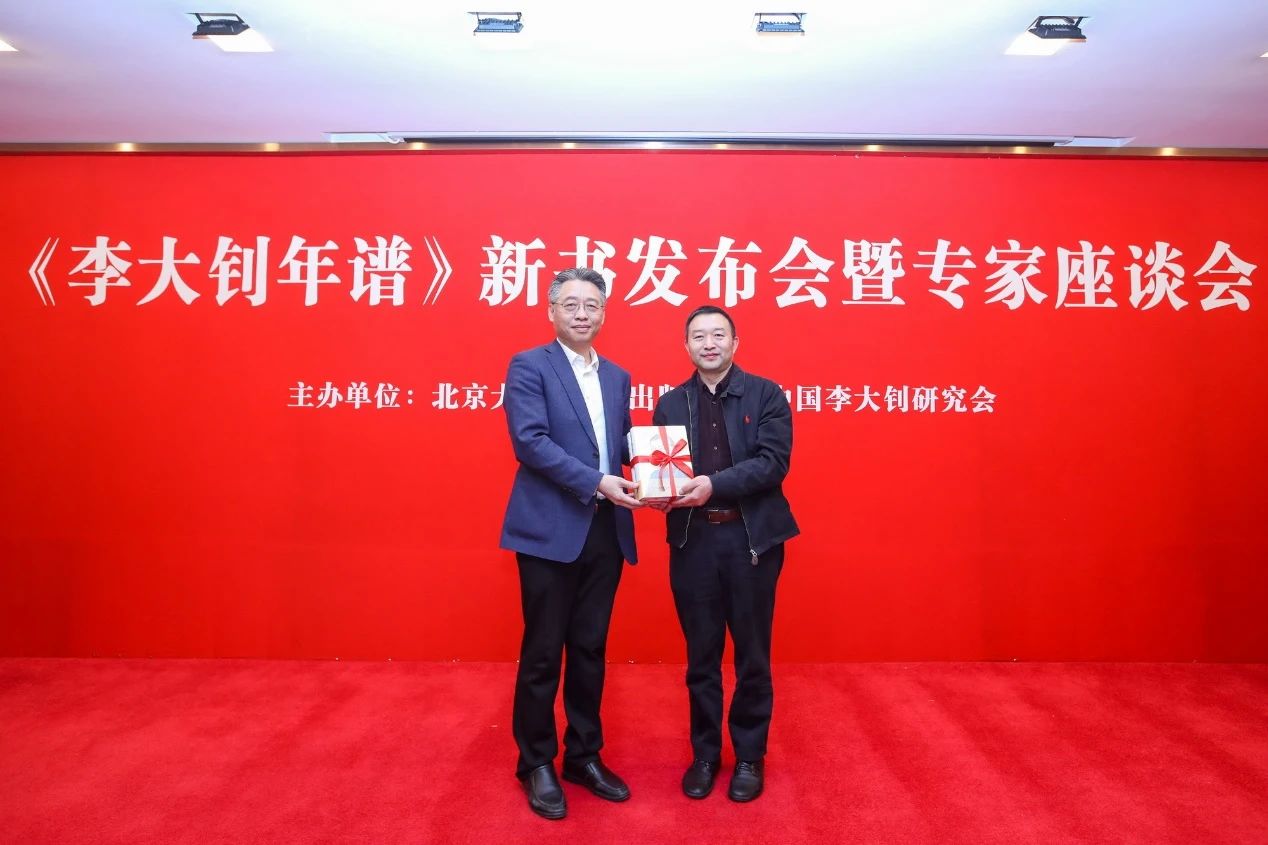 发布会上,作为双方代表,云南出版集团党委委员、云南教育出版社社长胡平向北京大学图书馆馆长陈建龙赠送《李大钊年谱》20套。