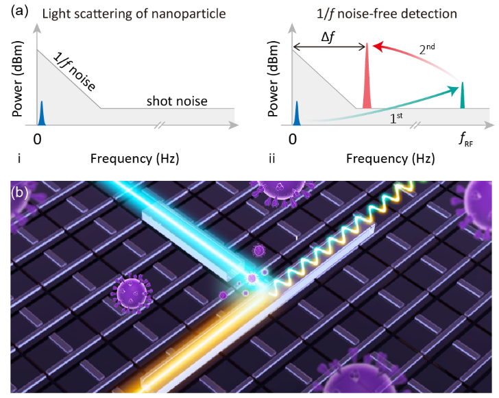 (a)1/f 噪声抑制机制;(b)基于片上波导暗场外差干涉仪的单颗粒检测