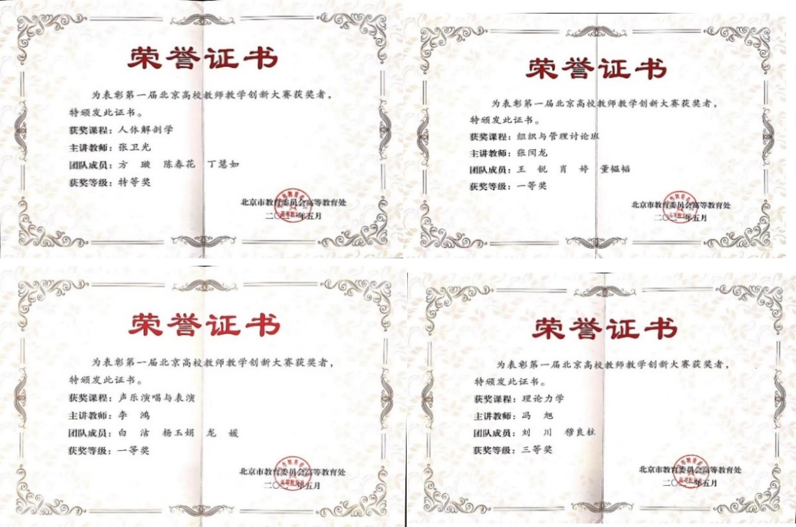 基础医学院张卫光教授团队《人体解剖学》获得特等奖,光华管理学院张闫龙副教授团队《组织与管理讨论班》、歌剧研究院李鸿副教授团队《声乐演唱与表演》获得一等奖,物理学院冯旭副教授团队《理论力学》获得三等奖。其中,张卫光将代表北京市,参加7月底在上海复旦大学举办的“首届全国高校教师教学创新大赛全国赛”。