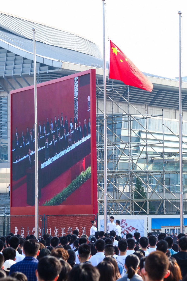 全体起立,奏唱国歌,升旗仪式结束后,北京大学2021年开学典礼正式开始。