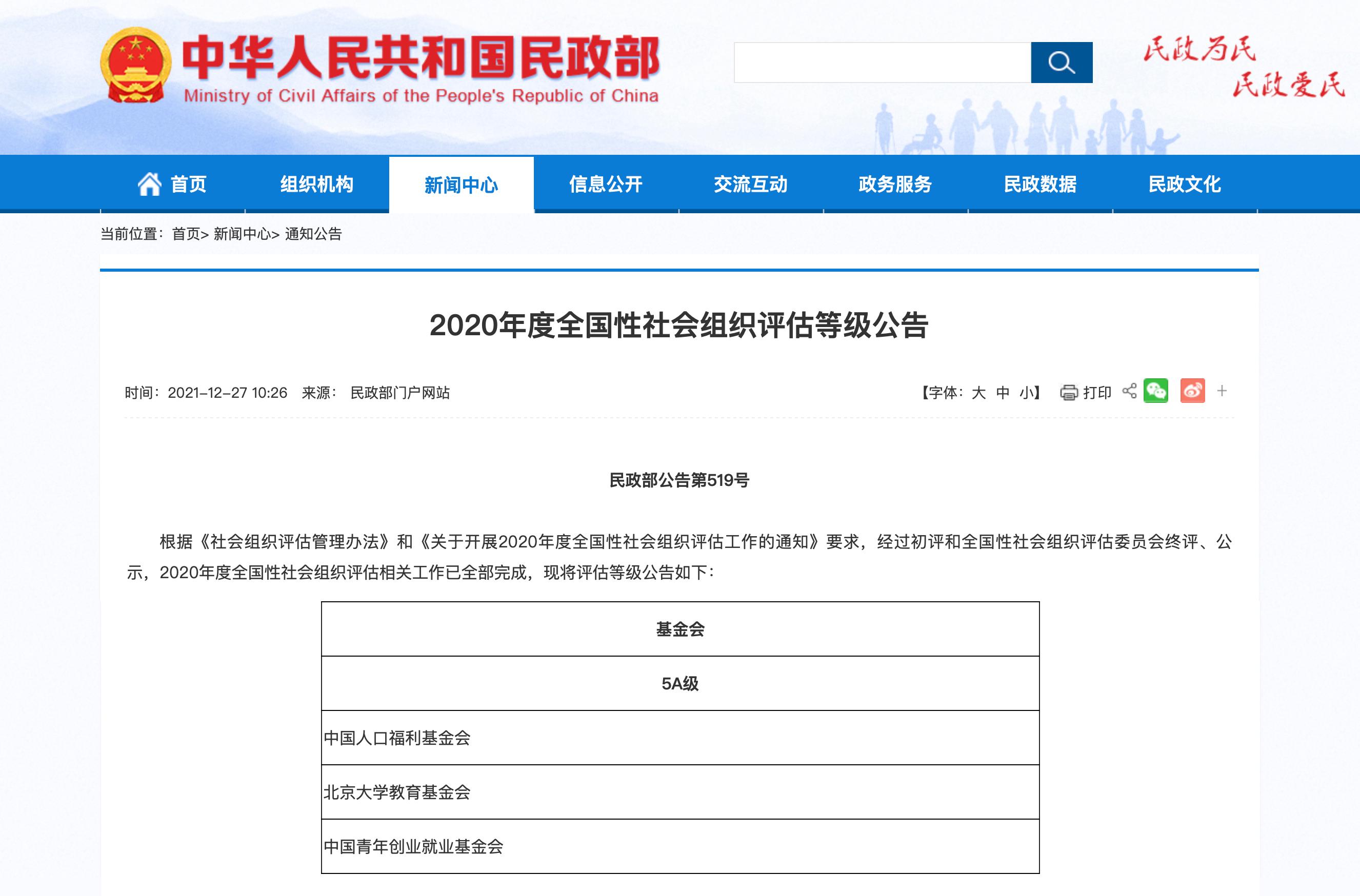 2021年12月24日,民政部发布2020年度全国性社会组织评估等级公告,北京大学教育基金会再次被评为最高等级——5A级基金会。